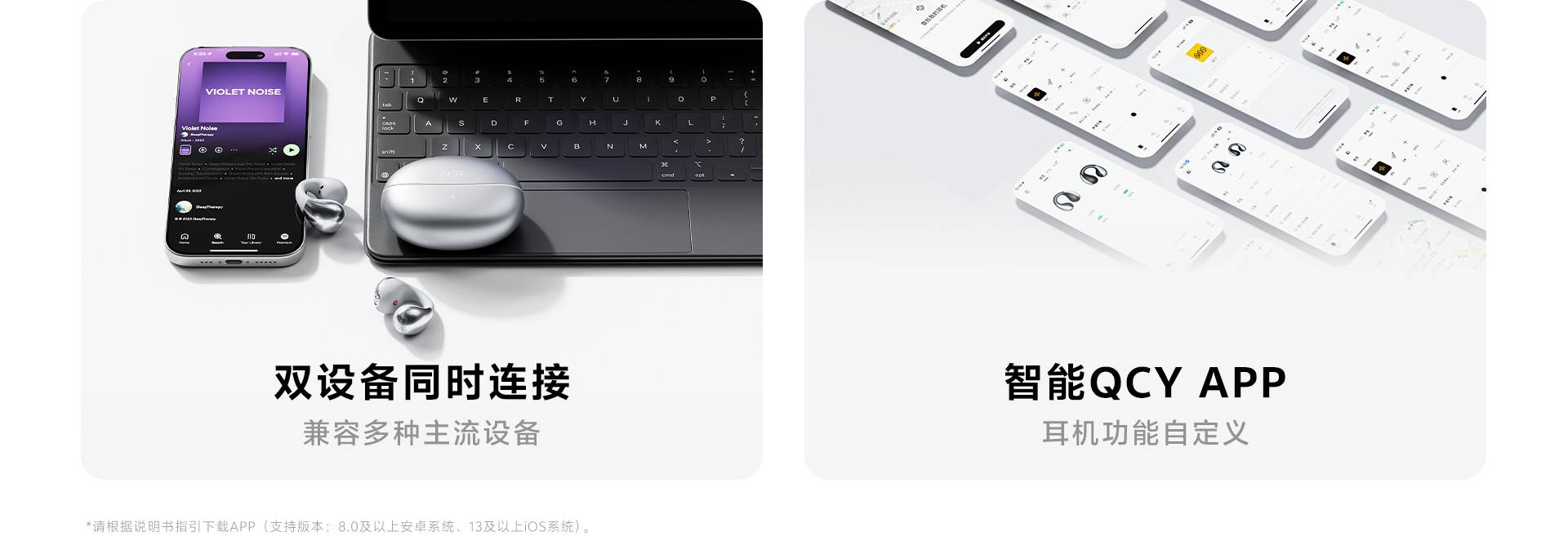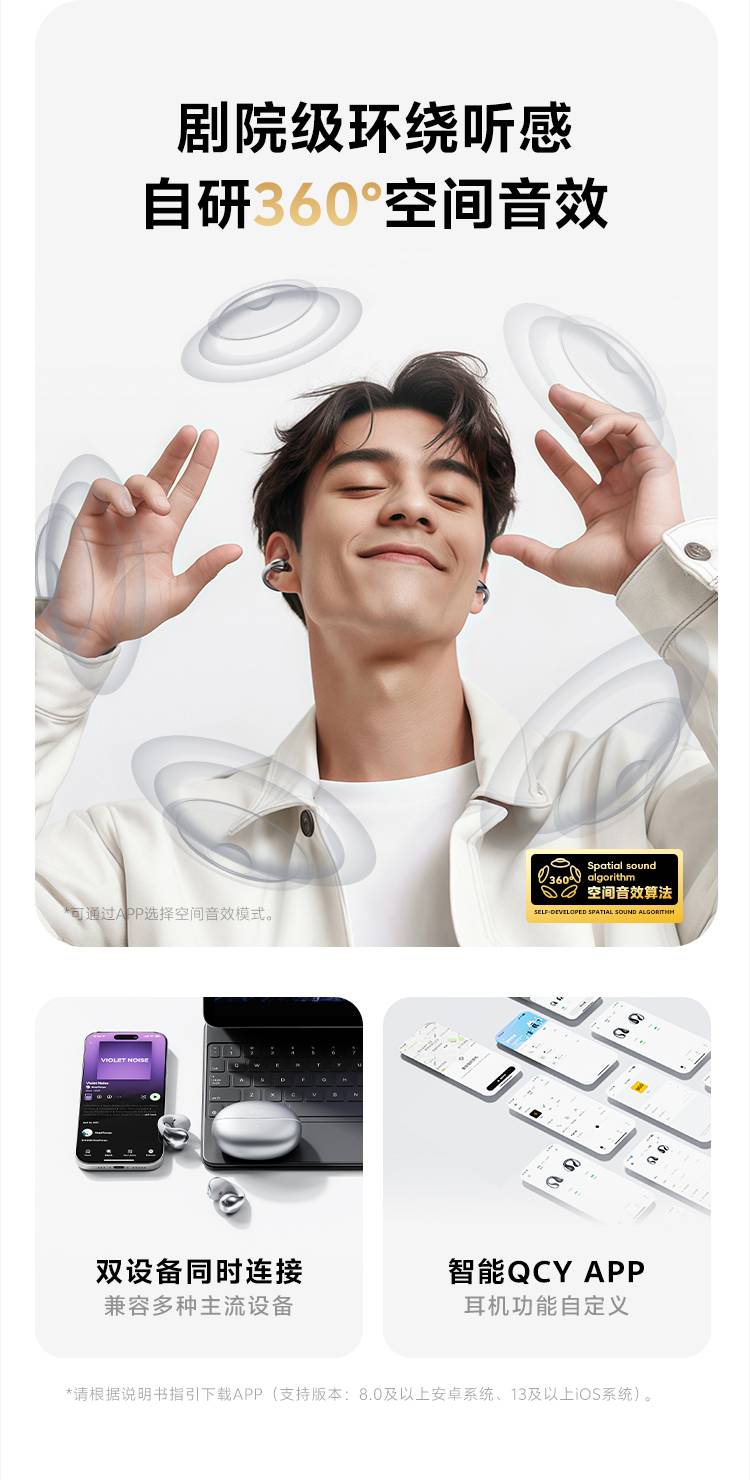 QCY定制耳夹声学调音,搭载动态音频调节算法,低音更强劲