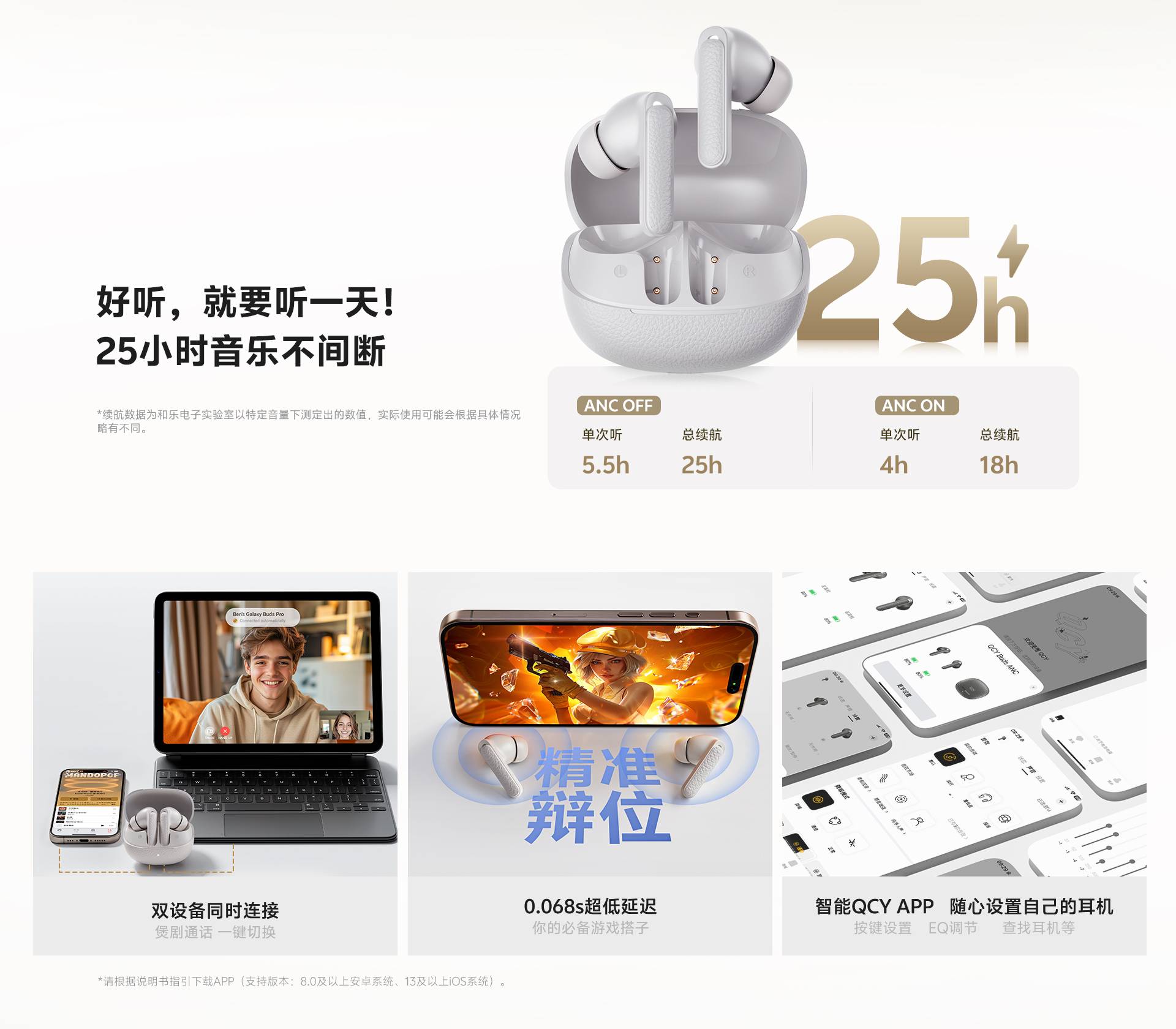 45dB自适应主动降噪 | 6麦通话抗风噪 | 高级仿真牛皮纹