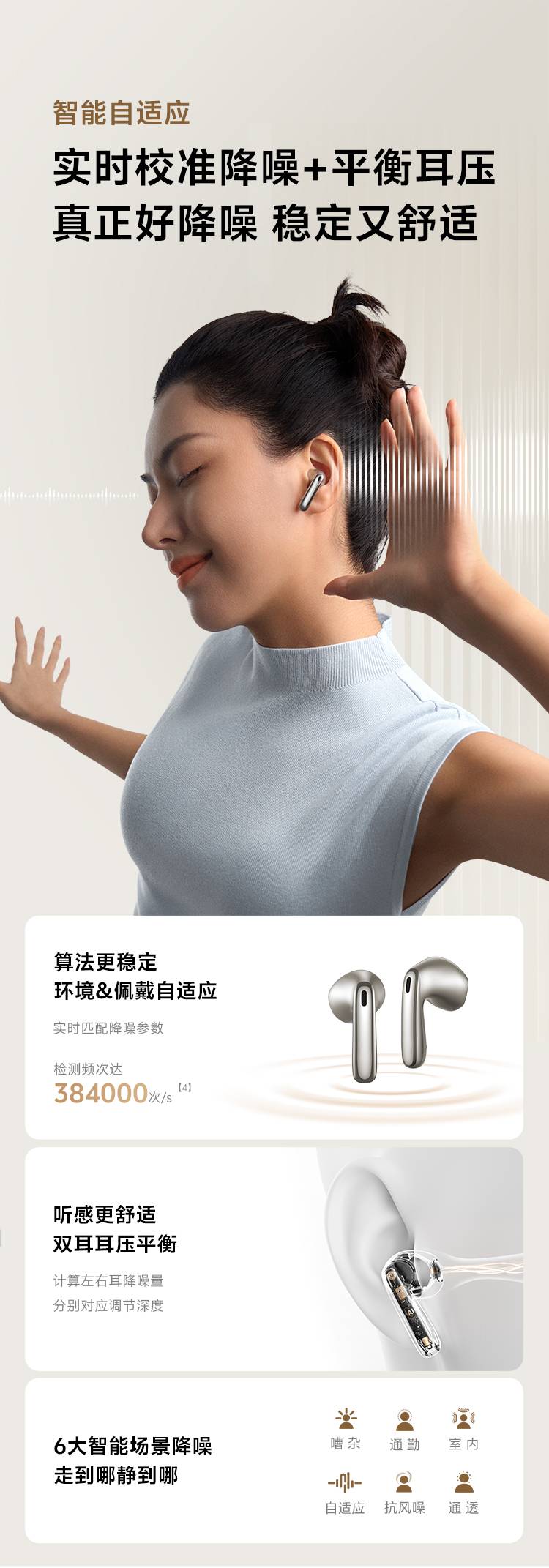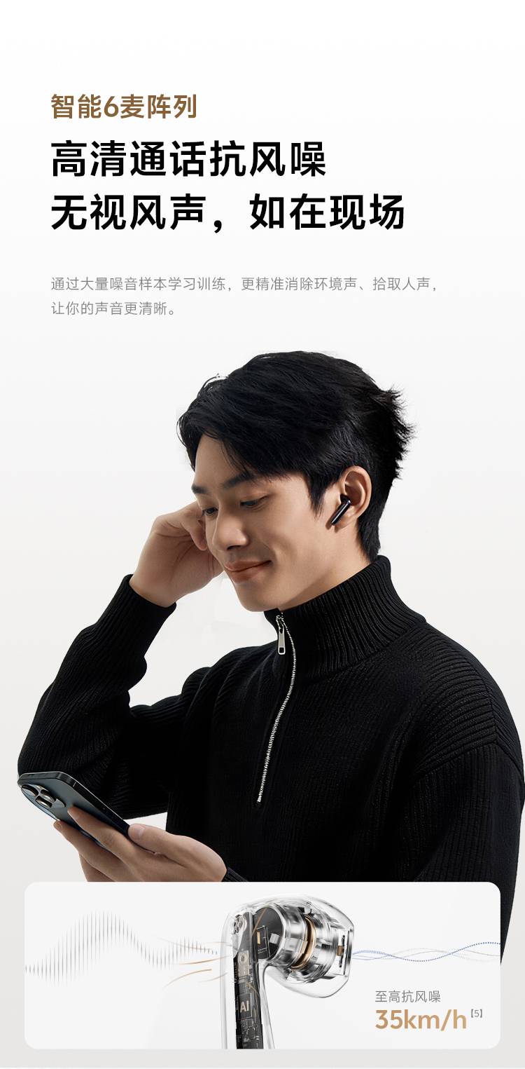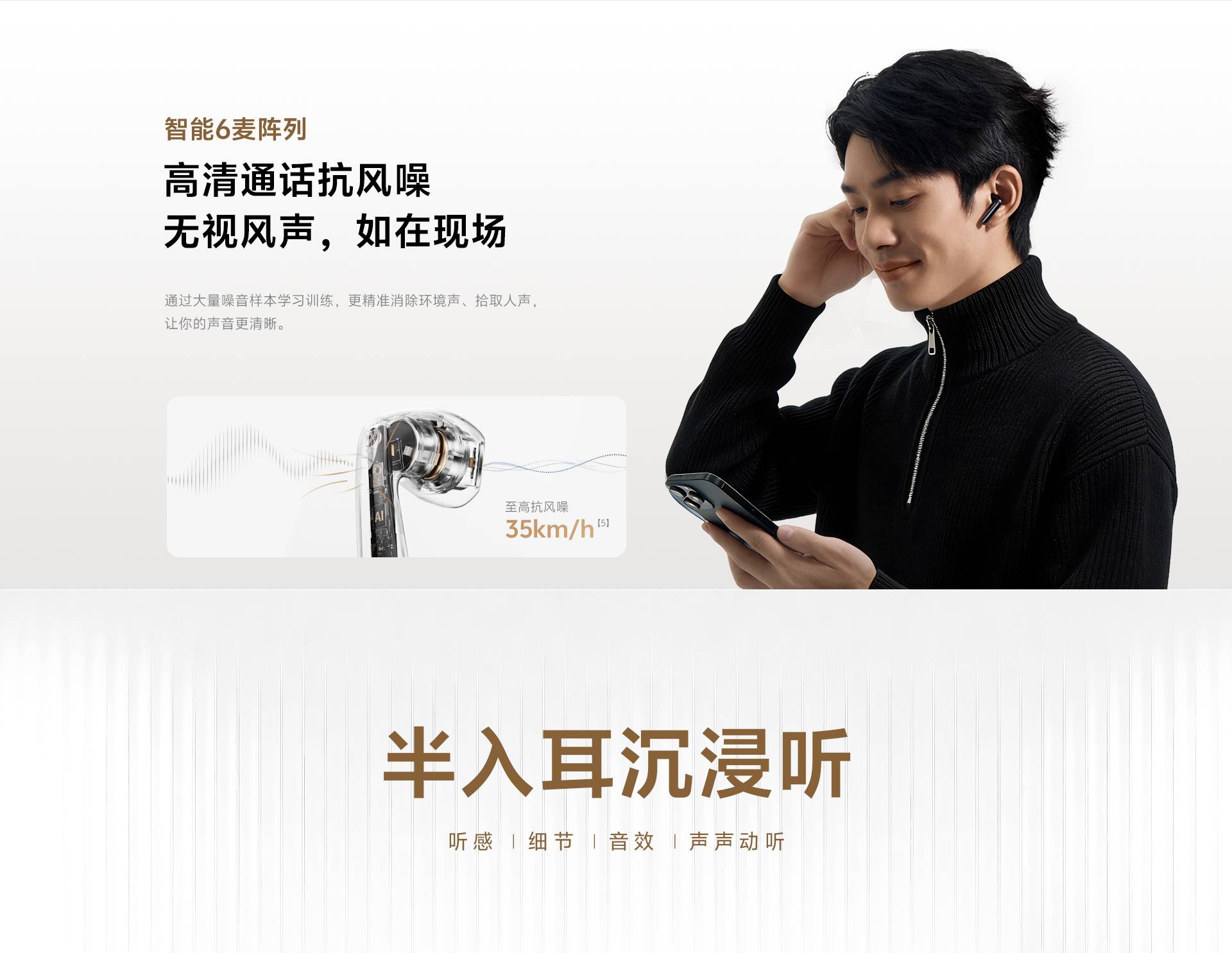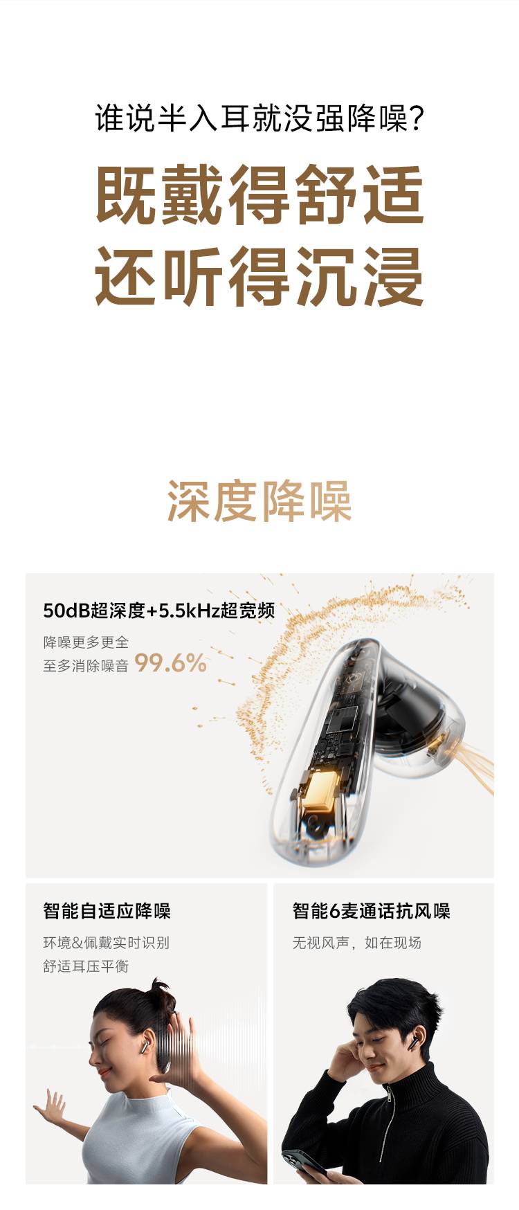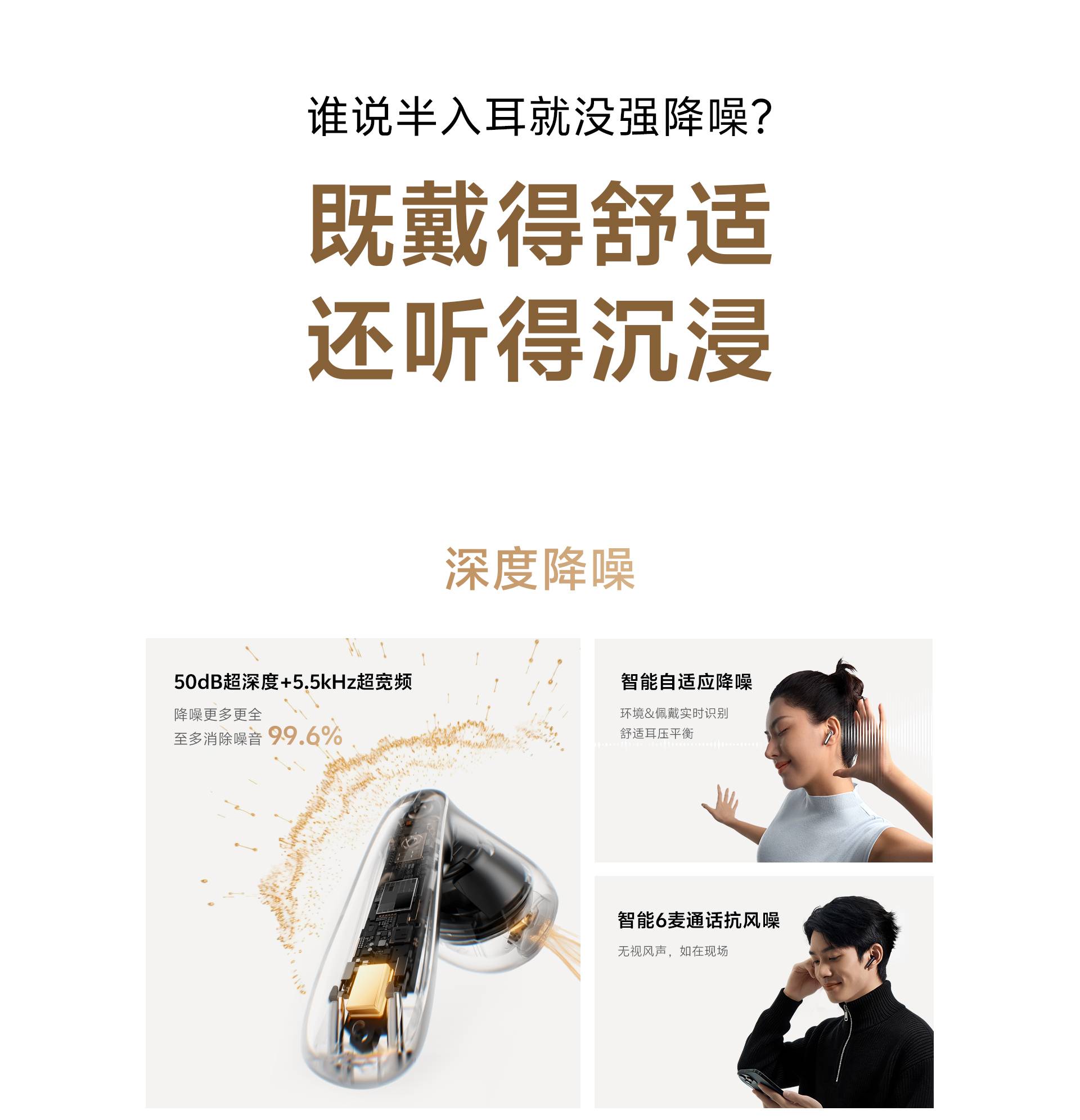 半入耳平衡主动降噪 | 6麦AI通话降噪 | 自适应抗风噪